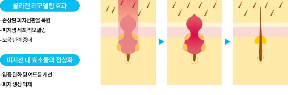 애플레이저 애플토닝은 순간적으로 발생되는 열이 피지선에 직접적으로 영향을 미쳐 피지 분비를 감소시키며, 피지선에 열손상을 일으켜 피지선 불륨 감소에 직접적으로 효과를 나타냅니다.