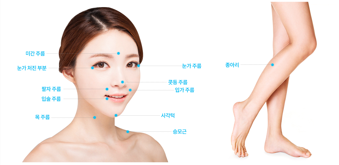 시술부위 이마 미간 팔자 등의 표정으로 인한 주름이 생기는 근육층, 사각턱, 종아리 근육 턱선, 목주름, 눈가 등의 탄력이 떨어진 피부층 얼굴 전 부위