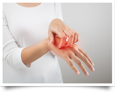 반복적인 가려움증과 접촉, 자극 부위의 발적, 발진, 염증, 동전 모양의 습진, 손·발바닥에서의 수포, 농포, 약물에 의한 약진, 대사 장애, 전신 질환과 동반되기도 합니다.