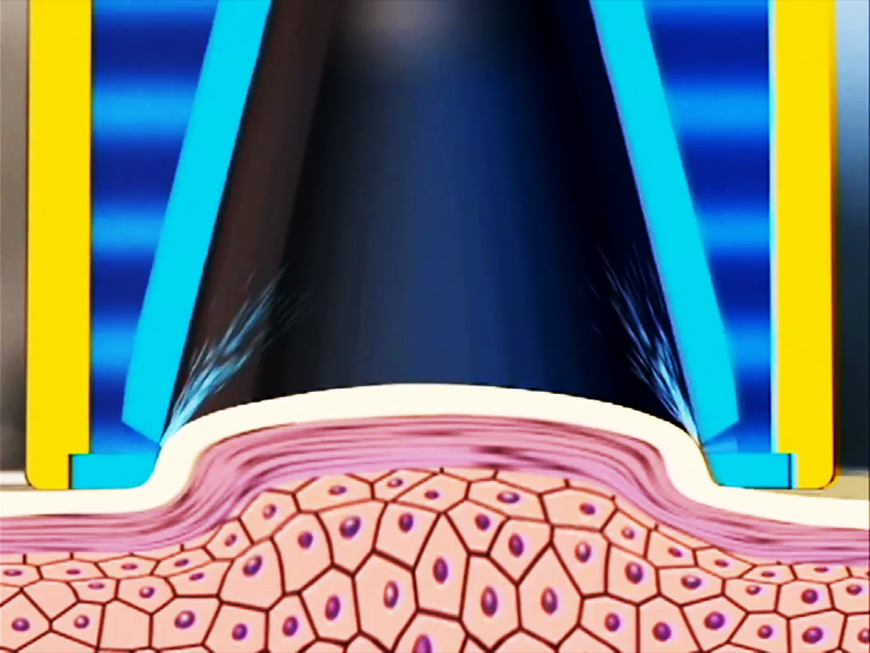 핸드피스 팁 내부로 피부를 끌어올려 모공을 개방시킵니다.